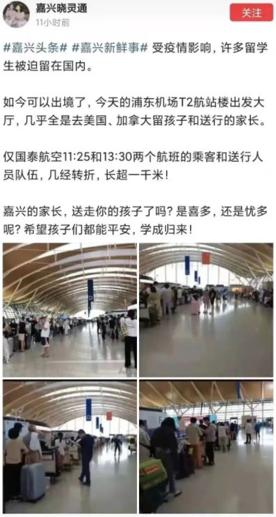 根据微博用户嘉兴晓灵通爆料,8月16日,在浦东机场T2航站楼的出发大厅,几乎全是去美国、加拿大留学的孩子,以及送行的家长。