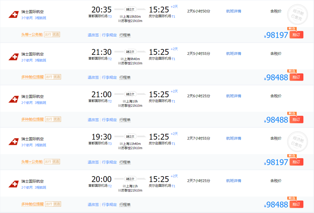 而经济舱很快都被抢光,剩下的公务舱混合单程票,甚至将近10万一张。