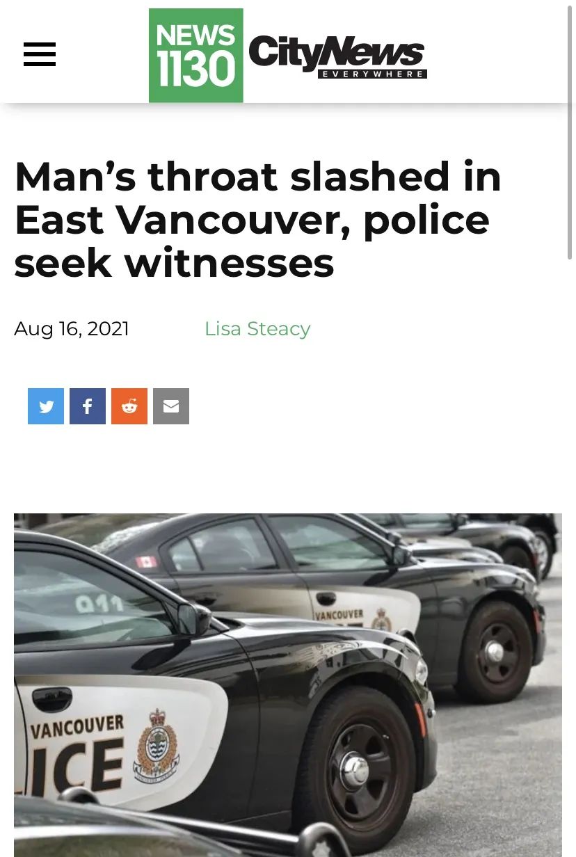 虽说温哥华的枪案时有发生,不过大部分都是帮派斗争,有针对性的杀人放火,跟遵纪守法的华人没太大关系。但刚刚发生的一个恶性案件,却是对着不相干的陌生人,而且上来就是一刀割喉,下了死手,实在是太恐怖了!