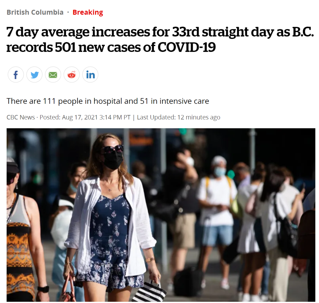 【加拿大乐活网lahoo.ca 程序综述】据CBC 报道,BC省8月17日宣布过去24小时新增新冠感染病例501例,全省7日平均日新增已连续33天上涨。