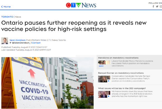 在宣布暂停解封的同日,安省政府还公布了一系列新的疫苗接种政策。在疫情高危环境下,这些新规不得晚于9月7日(大规模返校日)实施。