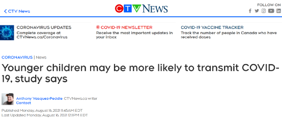 据CTV News 8月16日援引一项最新研究结果报道,与年龄较大的儿童相比,年幼的儿童可能更容易传播新冠病毒,而传播率最高的是3岁以下儿童。