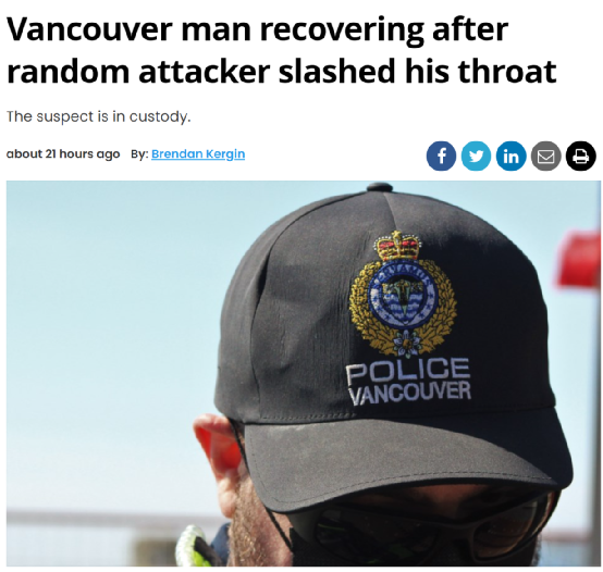 根据温哥华警方发布的声明,受害男子的喉部和颈部遭受了多处严重刀伤,但医院医护人员将其伤口缝合完毕后就让他自行离开了。