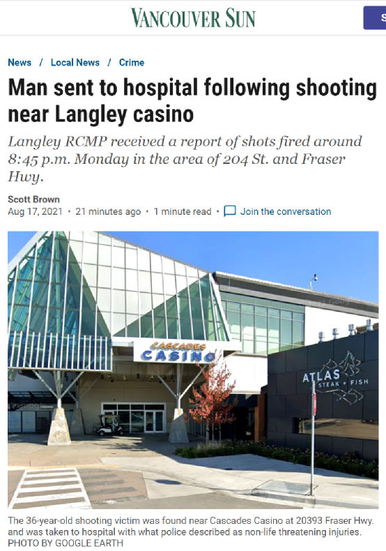 8月16日晚8:45,兰里皇家骑警接到报警称,204街夹菲莎高速公路附近区域的一家赌场发生枪击案件。