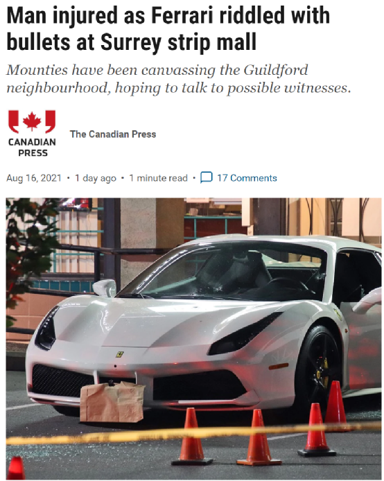无独有偶,据《温哥华太阳报》报道,8月15日午夜时分,素里皇家骑警也接到了有关枪击的报警。警方赶往事发点的Guildford购物中心后,发现一名男子中弹。