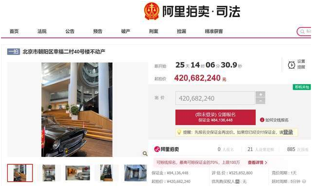 最近,阿里拍卖发布了一则公告,北京市第三中级人民法院将在9月11日对位于三里屯的一栋房产进行拍卖,起拍价约为4.2亿元。根据公告给出的拍卖地址,记者查询到,该房产应该就是耀莱新天地,而房产背后的所有人则为綦(qí)建虹。