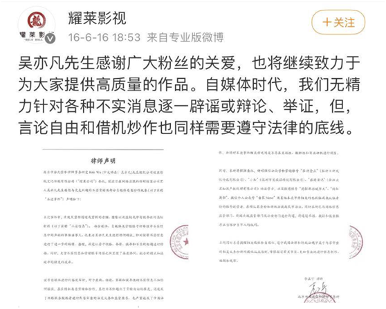 合照风波2年后,吴亦凡因“小G娜”事件引发争议,耀莱影视在此时出现,宣布签下吴亦凡。对耀莱影视来说,签下当时在顶流梯队的吴亦凡,也算是一桩稳赔不赚的生意。