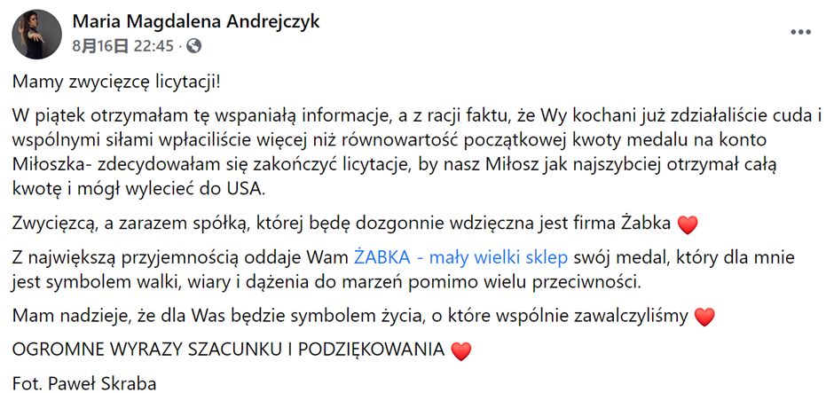 “我们找到了拍卖的中标者!你们已经创造了奇迹,为Miłoszek筹得了超过预定金额的善款。我宣布拍卖结束,Miłoszek将会尽快飞往美国。”
