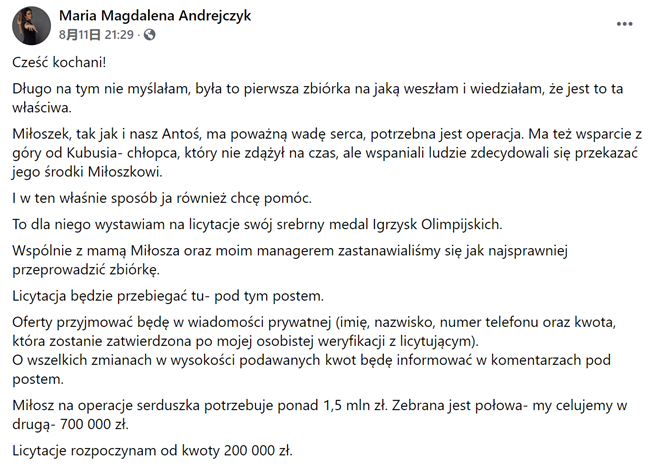 “Miłoszek有严重的心脏缺陷,他需要动手术……我没用多长时间就做出了决定,这是我参加的第一个筹款活动,我知道我的决定是正确的……正是为了他,我才决定拍卖我的奥运银牌”,
