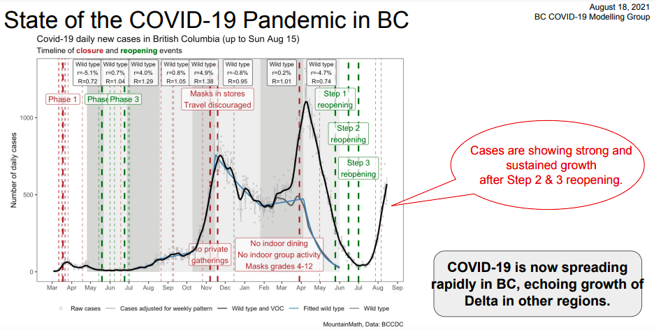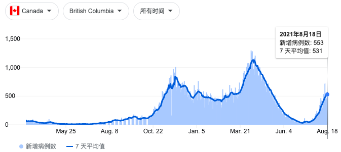 8月16日本周一,BC省一气儿报告了1,434例新病例(3天);8月17日501例,8月18日553例,眼瞅着这节奏,要不了多久就上千了。回想一个月前,BC省的七日平均值还不到50例呢。一个月时间翻十倍,这速度也是没谁了……