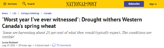 事实也确实如此,除了6月底在BC省直接热死500余人的热浪外,据《国家邮报》(National Post)8月19日报道,整个加拿大西部的干旱天气预计将导致当地春小麦减产25%——到时候面粉、面包等小麦制品的涨价怕是免不了的。