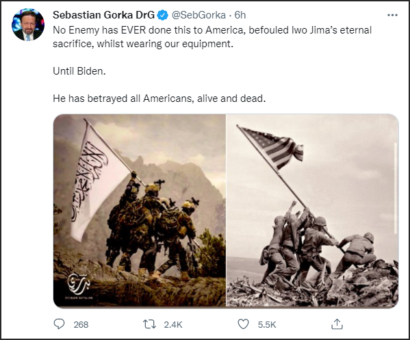 “从来,从来没有敌人对美国做过这种事,这玷污了硫磺岛永垂不朽的牺牲,而且他们还穿着我们的装备。”曾任特朗普国家安全顾问的保守主义政客、新闻人塞巴斯蒂安·戈尔卡(Sebastian Gorka)发推称,“直到拜登,他背叛了所有活着的、死去的美国人。”