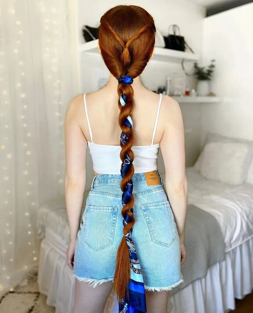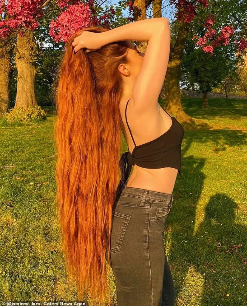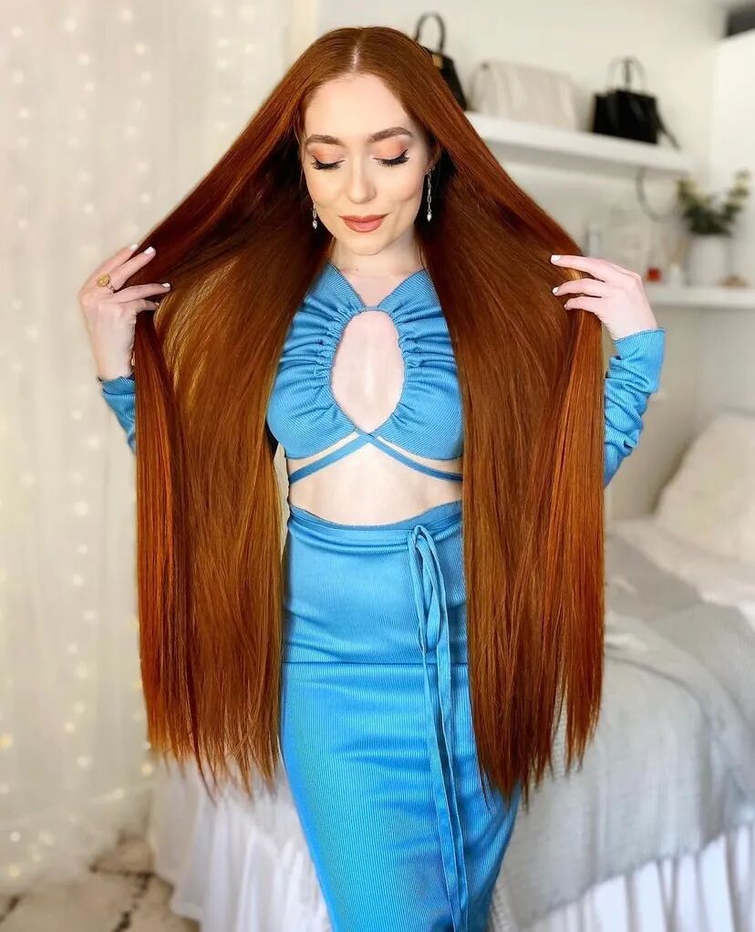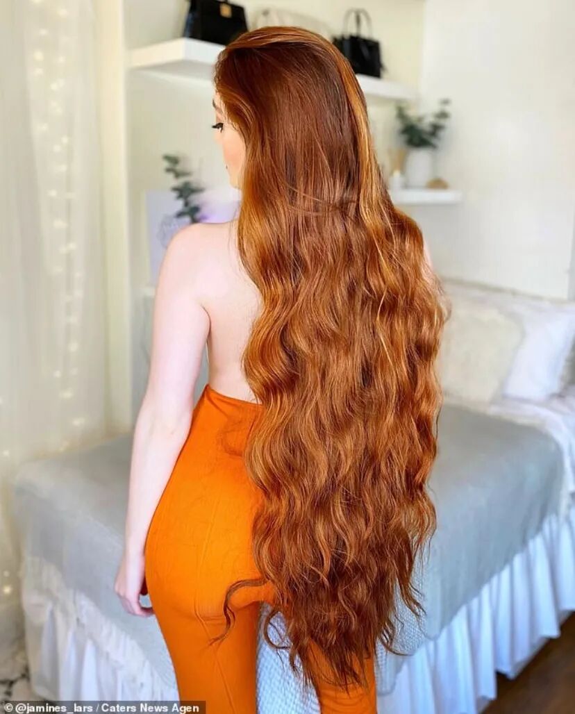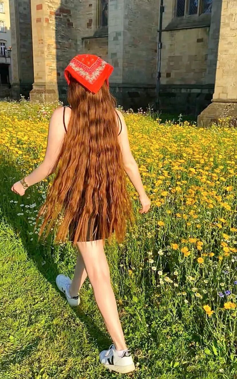她有一头长达1.2米的火红秀发,看看这光泽度、柔顺感、发量、发色,简直是真·长发公主。