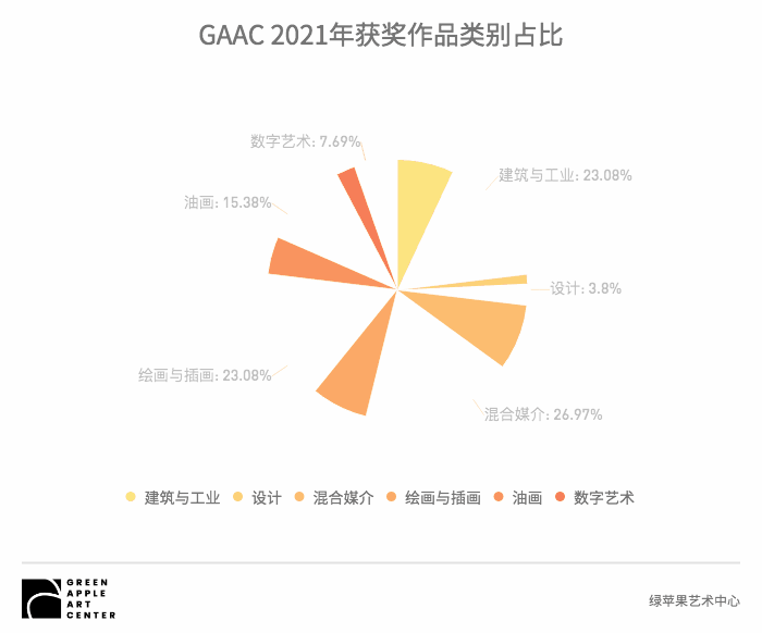 建筑与工业设计一直都是绿苹果教学的强项,但同时我们在其他艺术类别也取得了很好的成绩。由下图可见,我们在绘画插画、多媒介艺术等类别也有很多获奖作品。