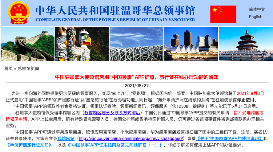 为进一步向海外同胞提供更加便捷的领事服务,实现“掌上办”、“零跑腿”,根据国内统一部署,中国驻加拿大使领馆将于2021年9月3日正式启用“中国领事”APP的“护照旅行证”及“应急旅行证”在线办理功能。同日起,“海外申请护照在线预约系统”在驻加使领馆停止使用。