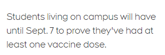 进入校内餐厅以及参加体育和室内俱乐部会议也需要提供疫苗接种证明。而且,所有室内公共区域,包括课堂学习,都将实施口罩规定。