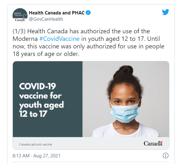 莫德纳疫苗方面,加拿大卫生部周五宣布,批准莫德纳疫苗用于 12 至 17 岁青少年。