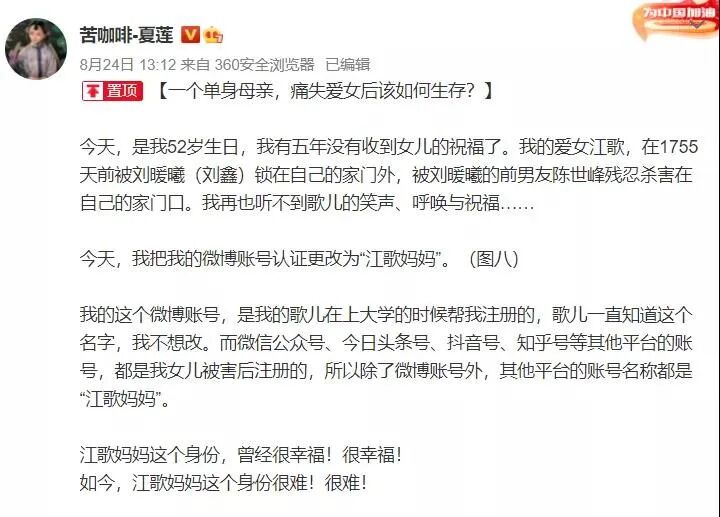 在这篇江歌妈妈微博上罕见的长文里,她宣布把自己的微博账号认证更改为“江歌妈妈”。