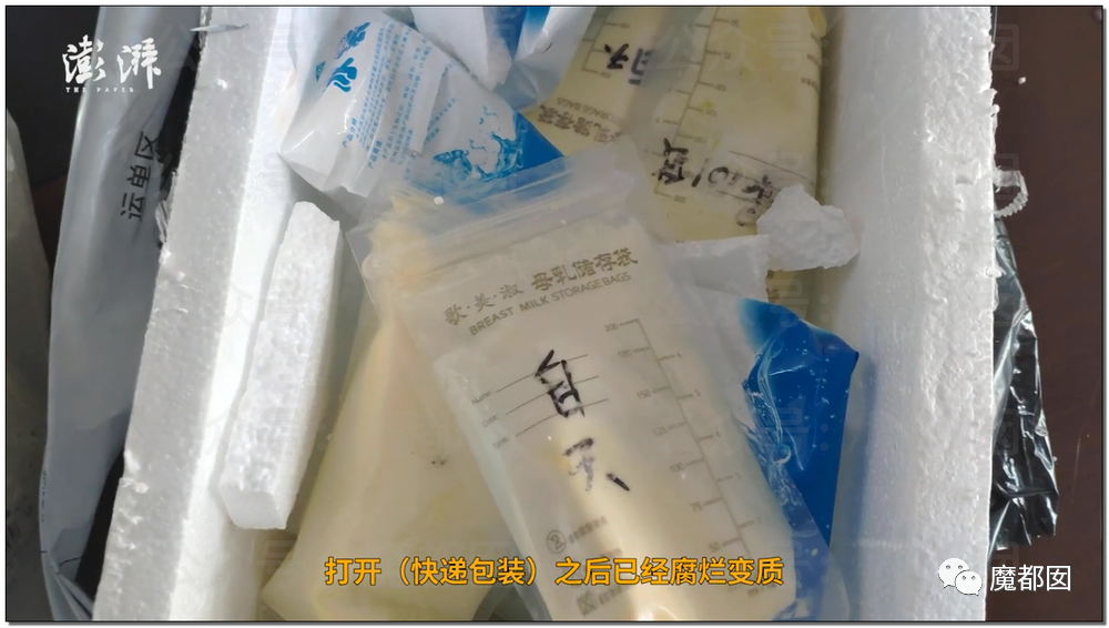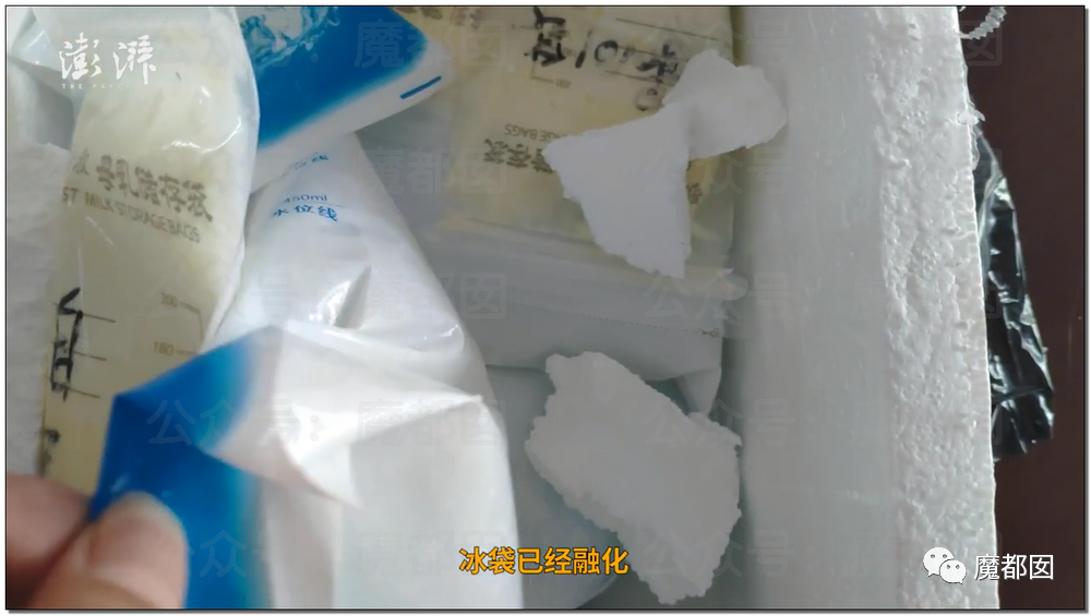 但是实际上运输的冷链很难保证冷冻。这是记者收到的,母乳+冰袋。
