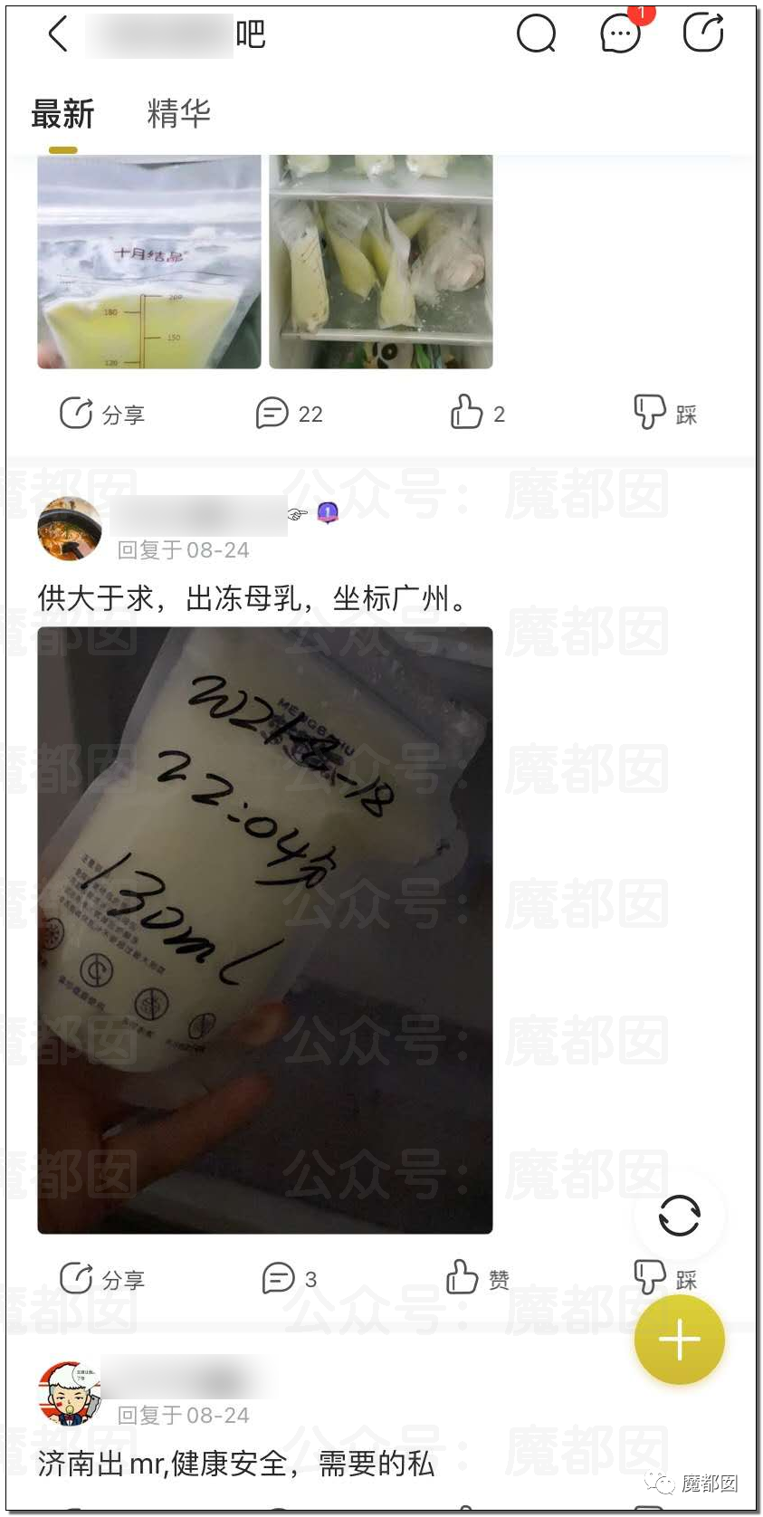 报道中提到了这么一个贴吧,本来以为是大家分享育儿知识,哺乳经验这种的,谁晓得,点进去一看,仿佛进入了一个人奶交易城……这个是澎湃的记者截的图: