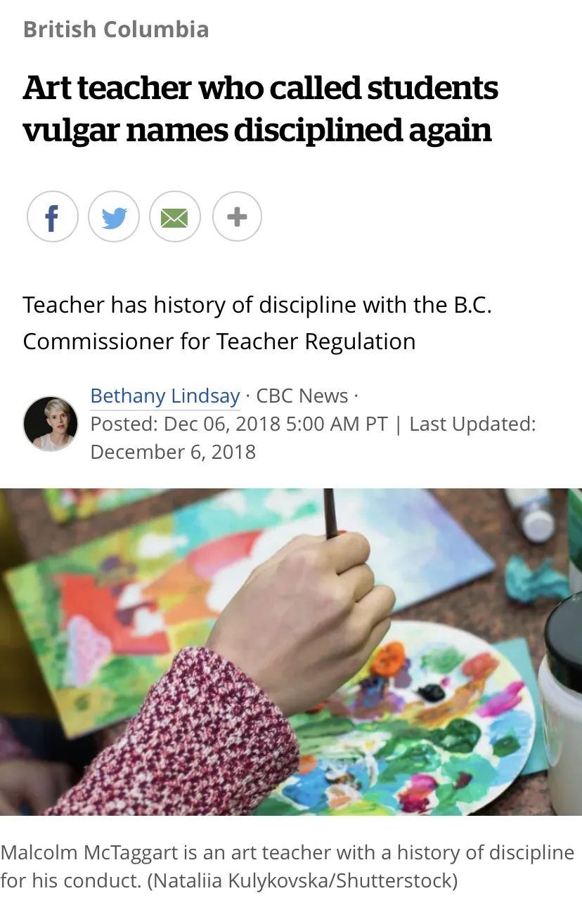 最近,一位曾就职于温哥华东区大卫汤普森中学(David Thompson Secondary School)和温哥华西区乔治国王中学(King George Secondary School)的教师,放弃教师资格证书,并辞去了工作。