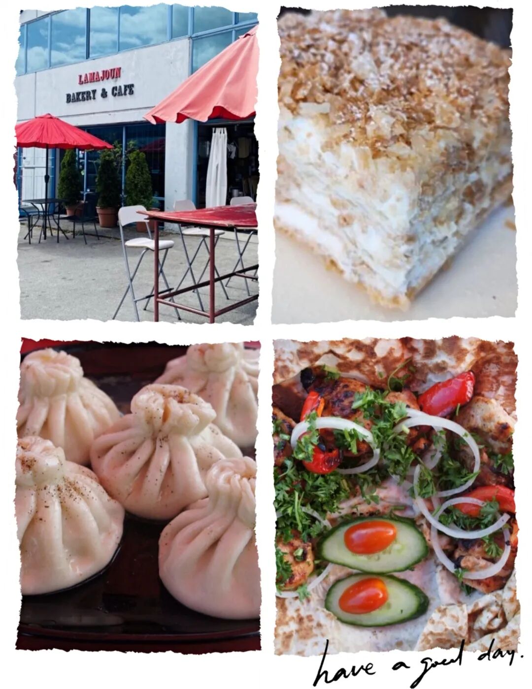 最受欢迎的就是下图中的饼、饺子和拿破仑蛋糕。户外有桌椅,狗狗可以趴地上。