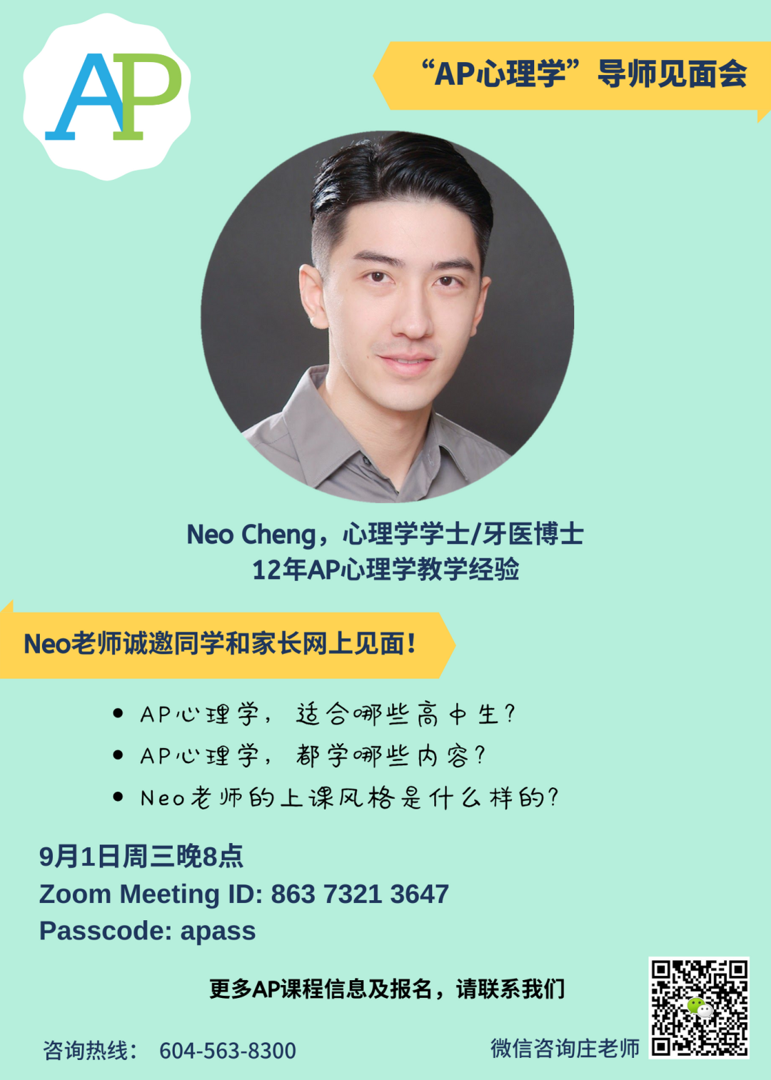 来参加周三9月1日的Zoom AP 心理学导师见面会/公开课吧: