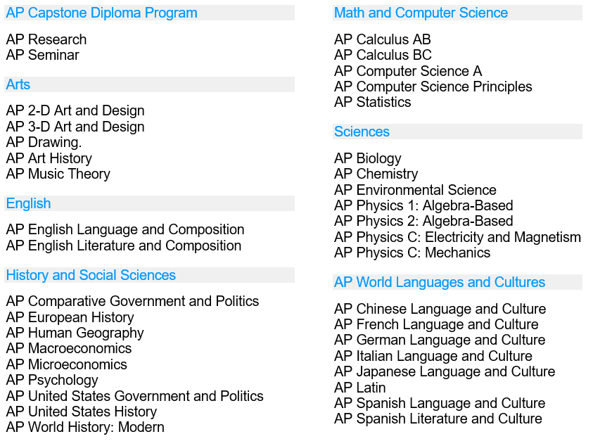 选择课程的时候,建议家长们考虑两点:一是学生未来的兴趣和特长;二是学科的难易程度。举例来说,孩子如果对商科感兴趣,可以选择AP微积分、AP统计学等、AP宏观微观经济学,只要有些数学基础就可以;如果未来打算学习计算机科学,可以选择AP 计算机科学,AP物理等。孩子如果语言能力比较强,可以选择AP英文、以及其它第二外语科目如AP中文、AP法语等语言类学科。