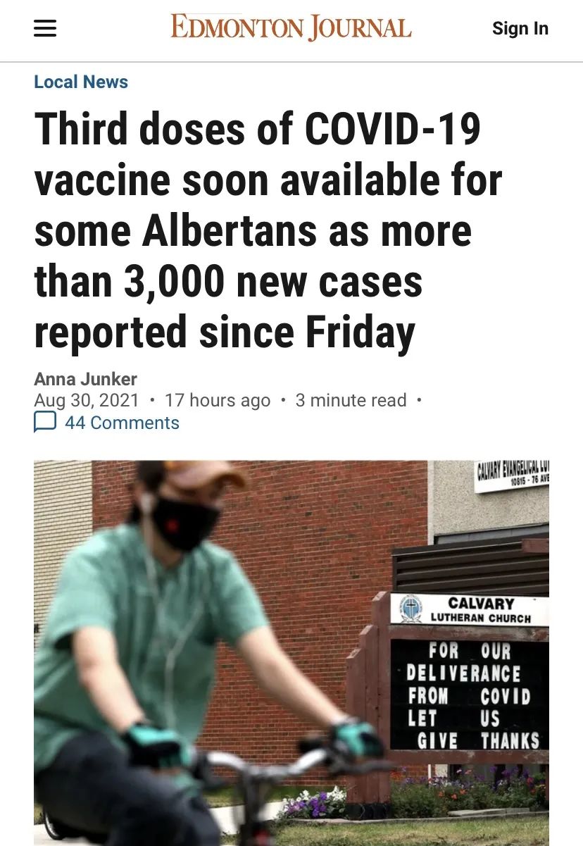 阿尔伯塔省8月30日宣布,将给长期护理院的老人、免疫功能低下者提供第三剂加强针。部分接受了混合疫苗并有到其他国家旅行的人,也有资格接种第三针。