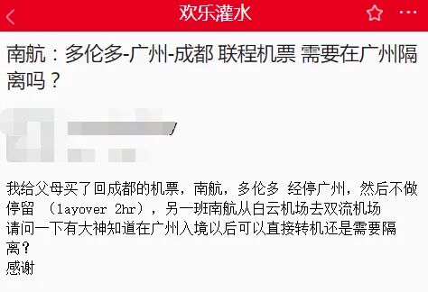 就有网友在约克论坛提问:南航,多伦多-广州-成都 联程机票,需要在广州隔离吗?