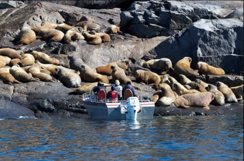 因纽特向导会用摩托艇把游客带到漂浮的冰面上搜寻,当目标海象被锁定,向导将继续带着游客穿过大块浮冰或小型岩石,悄悄靠近海象。