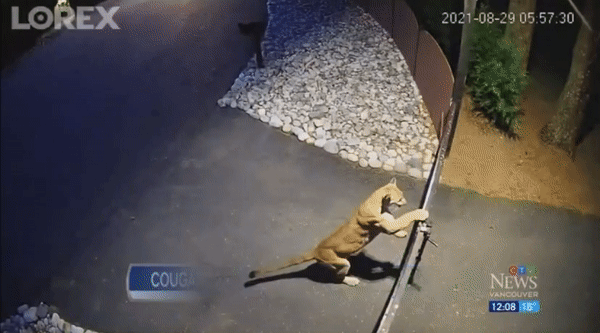 8月31日周日早上6点,在兰利North Otter地区55街和240街附近的一所房子里,监控摄像头清清楚楚拍到了一只强壮的美洲狮,轻轻一跃就跨过铁门,跳进了居民家中。