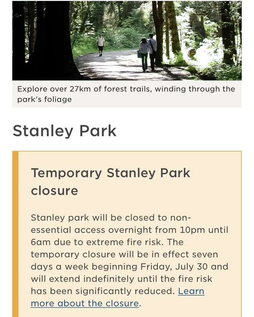 斯坦利公园管理处发出通知,紧急延长闭园时间,从每天晚7点关闭到次日早7点。