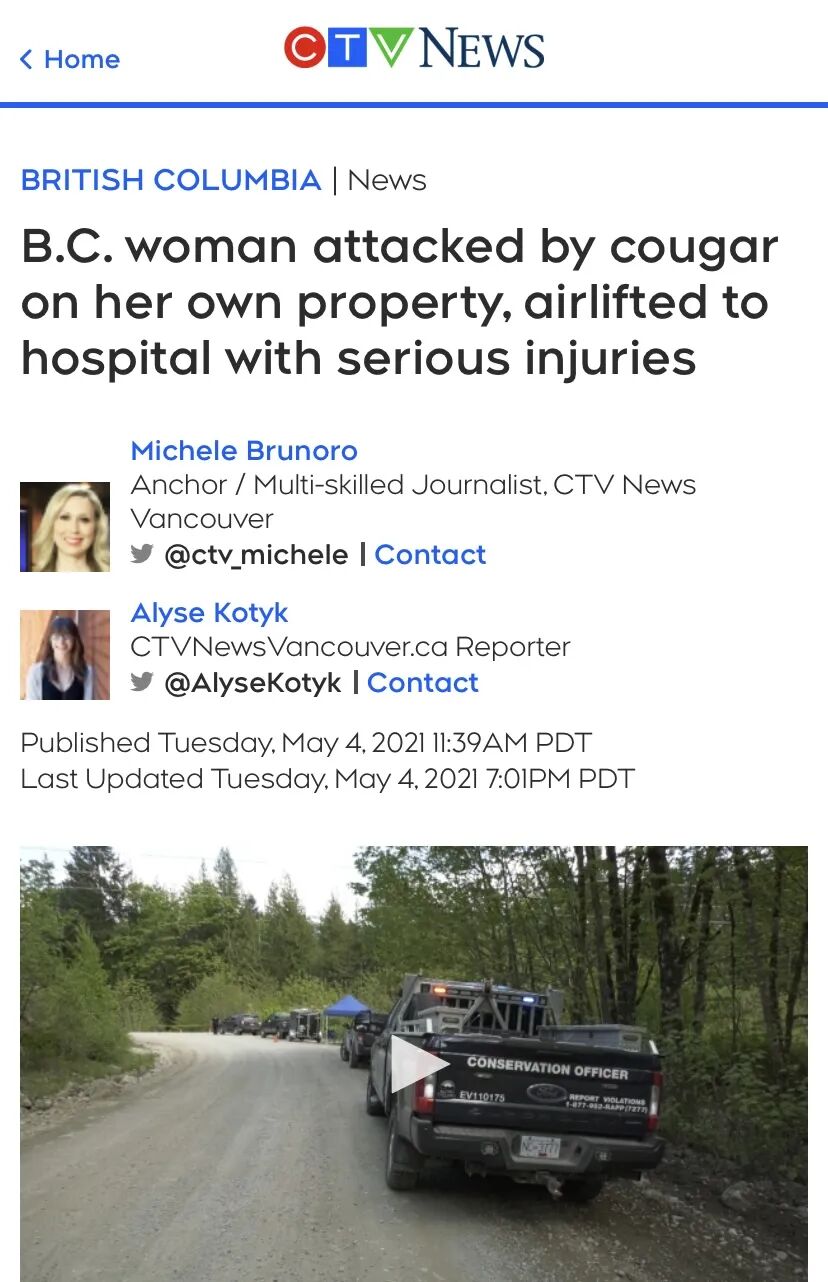 依旧是今年5月,BC省Fraser Valley附近的一名女子在散步时遭遇两只美洲狮同时攻击,被咬成重伤,要不是旁边一名男子听到惨叫声冲过来赶走了美洲狮,这名女子就没命了。