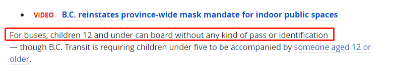 BC省运联在声明中写道,虽然孩子们可以免费乘车出行,但父母和监护人“仍然有责任在行程中照顾孩子,并为其提供足够的安全保障,包括当孩子在无陪同的情况下,需确定孩子是否可在无人陪伴的情形下乘坐公共交通工具”。