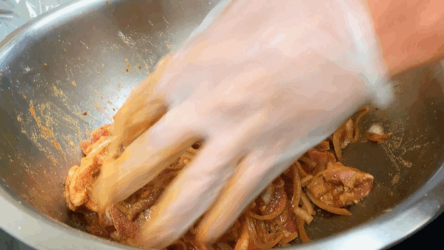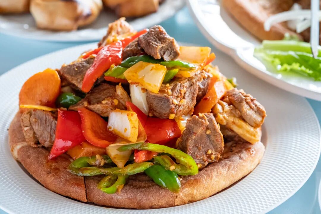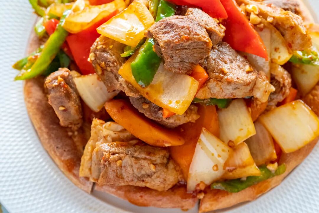 大块手切羊肉与洋葱、胡萝卜、青红椒加上蒜泥和番茄酱辣酱一起炒制,浇在馕上。一口馕一口肉一口菜,或者把所有的东西全部夹在馕中享用。辣中带着蒜香带着微微酸甜的菜汁全部收入馕中,哇,真的太好吃了!