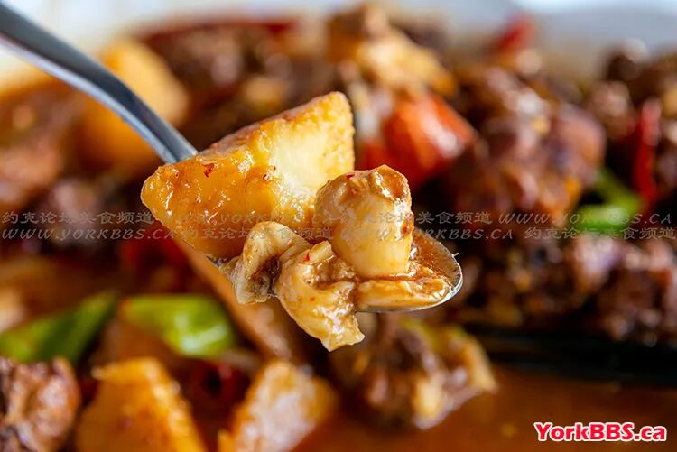大块土豆土豆土豆,已经炖到快要融化,绵软的土豆吸饱了汤汁,口感像肉一般绵密过瘾,还有点缀的青红椒蘸着汤汁清新清口。