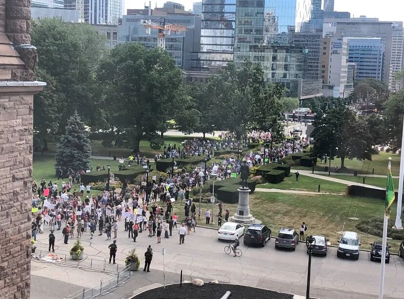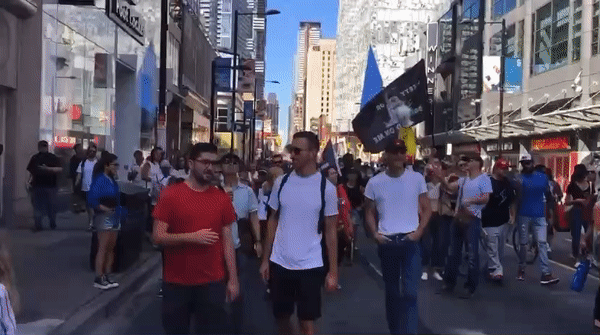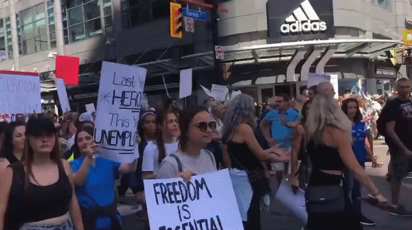 多伦多,9月1日上午,在省长福特宣布安省的疫苗护照计划后,数千名民众涌上街头,开始示威游行。从多伦多综合医院到皇后公园到市政厅,同样是乌央乌央的人群,同样是不戴口罩0距离,同样是封堵交通,骚扰民众,疯狂呐喊……