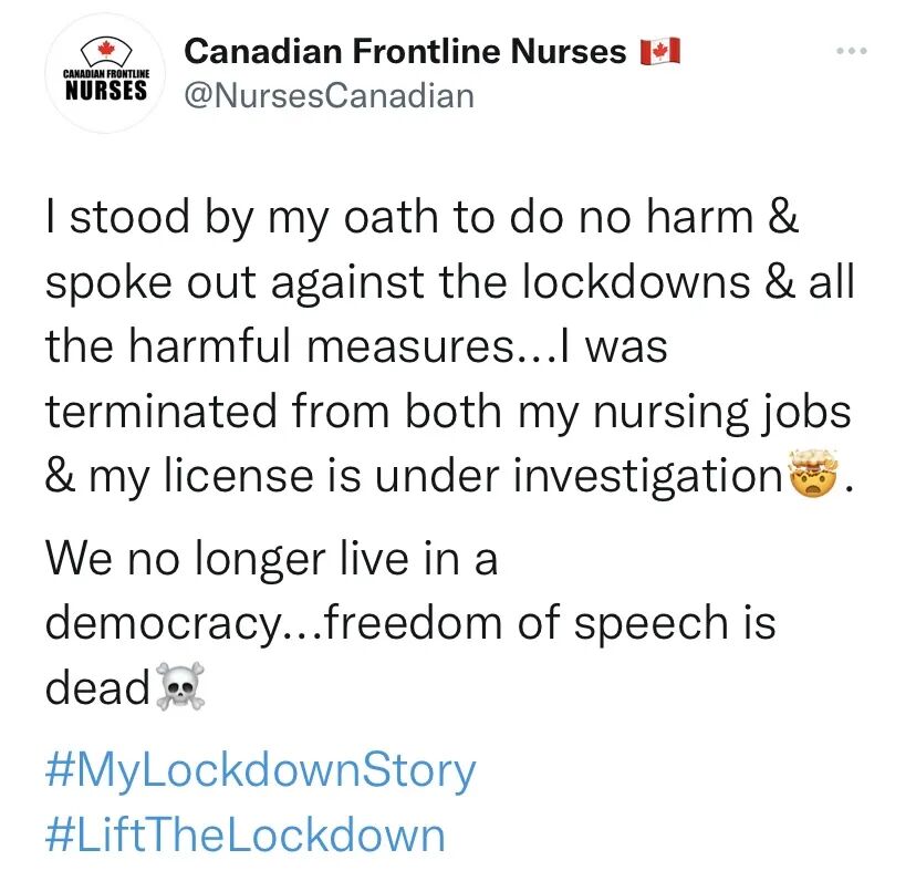 Nagle的两个护理工作都被解雇,她在推特上称:“我的行医执照正在接受调查。我们不再生活在民主国家,言论自由已死。”