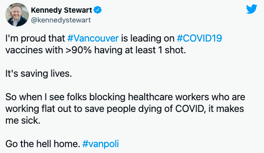被骚乱搞得筋疲力尽的温哥华市长肯尼迪·斯图尔特(Kennedy Stewart)则将抗议者描述为“疯子”、“一群混蛋”,“他们应该滚回家!”(Go the hell home)。