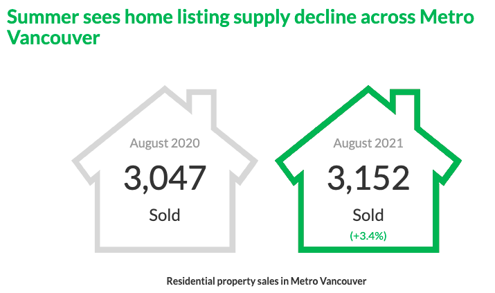 据大温地产局(Real Estate Board of Greater Vancouver)消息,大温地区 8 月的房屋销售总量为 3,152 套,比去年 8 月的 3,047 套增加了 3.4%,但比 7 月的 3,326 套下降了 5.2%。虽然整个夏季,大温地区的买家一直相当活跃,但自 6 月以来,待售房屋的数量平稳下降。