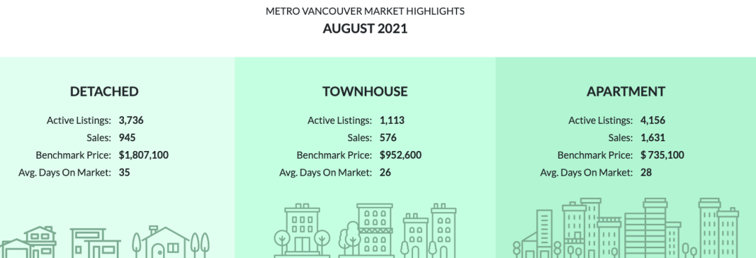 据大温地产局的 8 月数据,大温的独立屋挂牌房源多达 3,736 套,销售量为 945 套,基准房价去到 $1,807,100,平均上市 35 天售出。