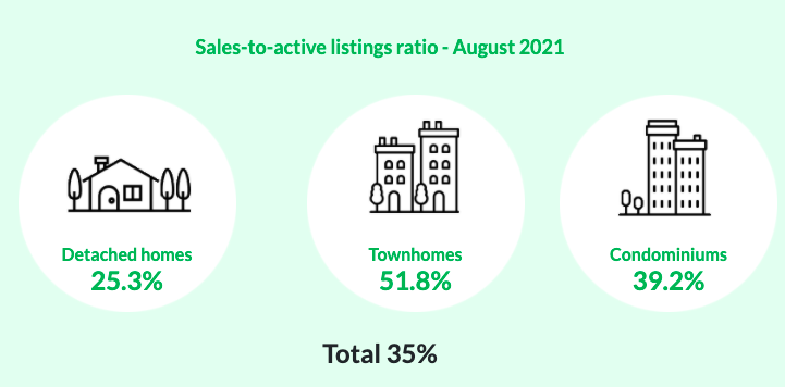 2021 年 8 月的挂牌房源产销率则为 35%,按房产类型划分,独立屋占其中25.3%,联排别墅占了51.8%,公寓占39.2%。