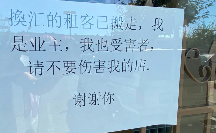 Jingdinglai Holding位处繁忙的购物中心,单位的窗户一度被打破,业主只能无奈贴出中文告示,称换汇公司已经搬走了,“我是业主,我也受害者,请不要伤害我的店”。