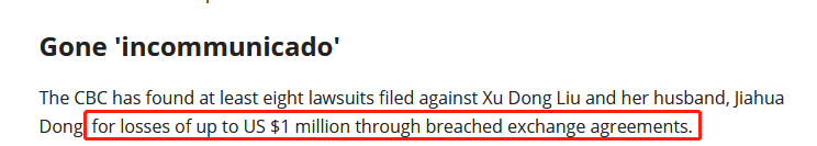 目前至少有 8 起针对Xu Dong Liu及其丈夫Jiahua Dong的诉讼,他们二人因违反协议而面临高达 100 万美金的损失。