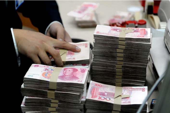 一名中国银行职员在一家银行清点人民币钞票。(图源:The Associated Press)