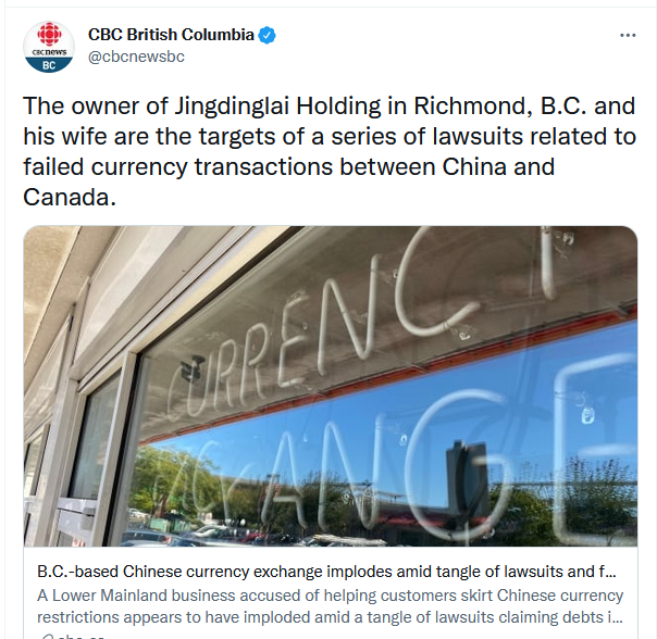 【加拿大乐活网lahoo.ca 江礼且综述】位于列治文市的换汇公司Jingdinglai Holding已人去楼空,近日,其所有人Jiahua Dong及其妻子Xu Dong Liu因为换汇业务出问题及客户收不到资金而成为诉讼目标,索赔金额高达一百万美金。