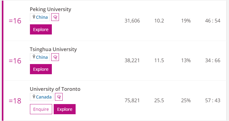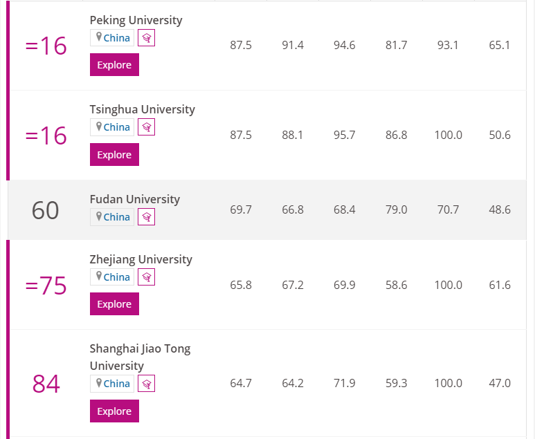 中国两所顶尖高校清华、北大排名都有大幅上涨,分别上涨7位和4位,最终并列16名,首次力压多伦多大学。此次也是清华和北大首次进入全球排名前20。