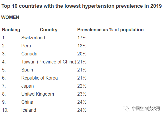 2019年全球女性高血压患病率最低国家/地区依次为:瑞士、秘鲁、加拿大、中国台湾、西班牙、韩国、日本、英国、中国和冰岛。