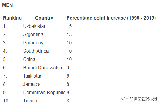 而在1990至2019年全球男性高血压患病率增幅最大的10个国家中,中国位列第五。